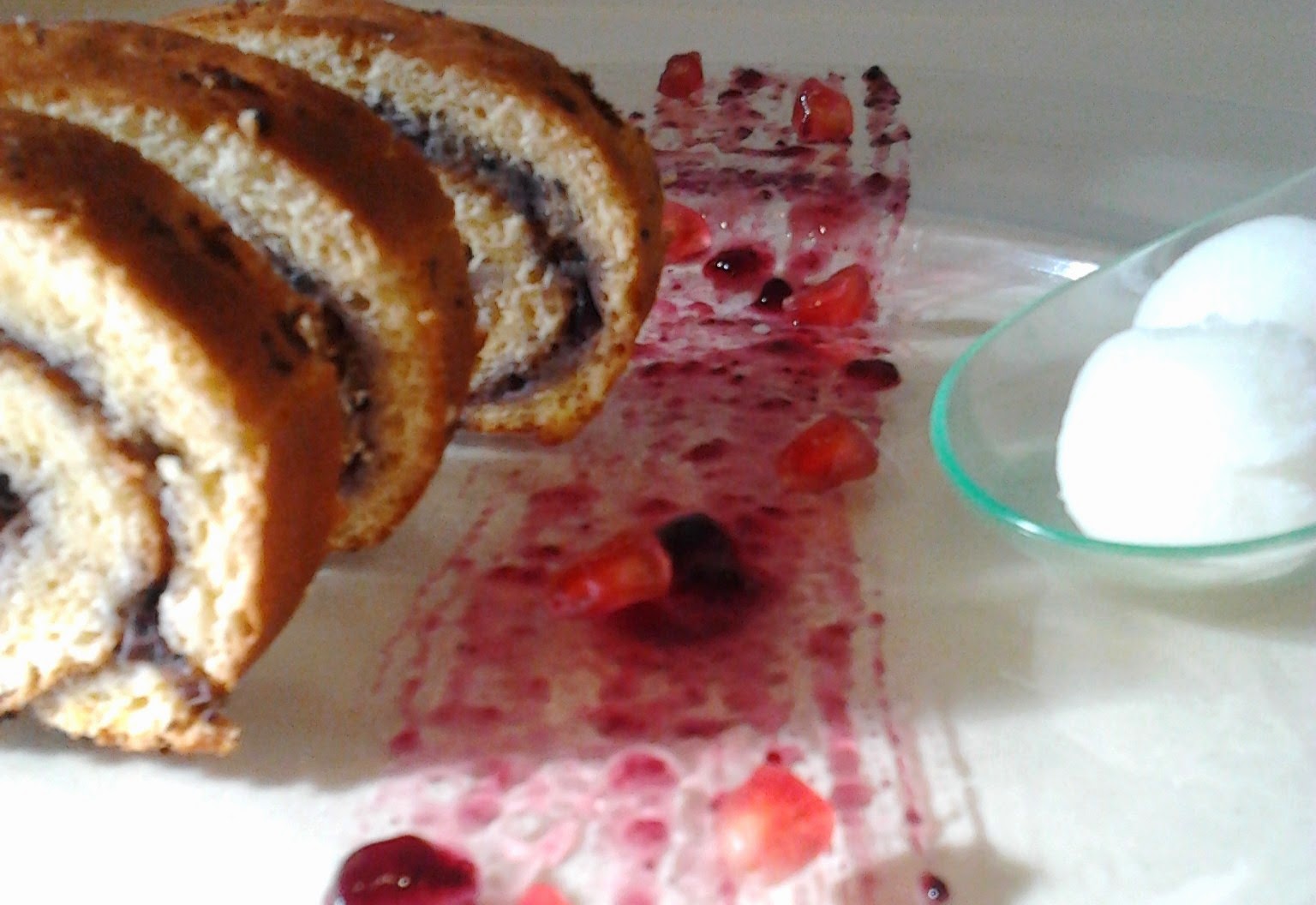Depositar la masa sobre papel sulfurizado en placa de horno ( añadir sabor-chispa-rockanroll espolvoreando limón rallado ), caliente a 220º, la introducimos durante +/- 8-10 minutos, como sucede con todas las masas delgadas, mirar antes por si estuviera. Una vez horneado, depositar la masa sobre un paño húmedo y cubrirla con otro paño, dejar enfriar, luego se retira el papel sulfurizado, cubrir la base con una confitura, yo he mezclado queso untuoso con un poco de nata y mermelada de arándanos, luego enrollar ayudándonos con el paño, añadir el azúcar glass. Cortar trozos y una forma más de acompañamiento es con una crema de vainilla.